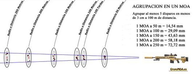 Agrupar cinco impactos dentro de un circulo 1 pulgada (2,54 cm) a cualquier distancia (que no sea 100 yardas), no es agrupar en un MOA, es agrupar en 1 pulgada.