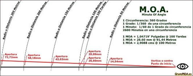 1 MOA = 2,9088 centímetros a 100 metros de distancia.