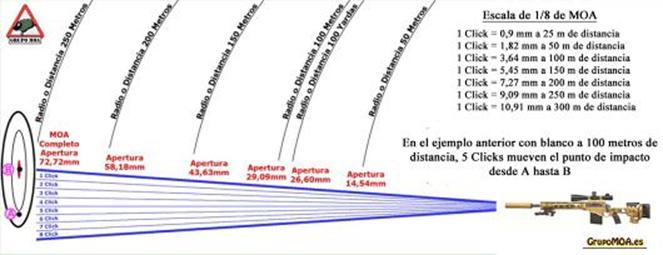 Imaginemos que realizamos un disparo sobre un blanco situado a 100m de distancia, pero el impacto ha fallado. Sabemos que el impacto ha quedado 1,9 cm más alto (o bajo, o a la derecha o izquierda), sabemos que el MOA equivalente a esa distancia (100 m) es de 2,9 cm. Sabemos que nuestra torreta corrige 1/8 de MOA en cada Click, es decir, que girando 8 Clicks en la torreta corregiríamos 1 MOA completo, y por tanto, cada Click equivale a 100 m de distancia a 3,64 mm.