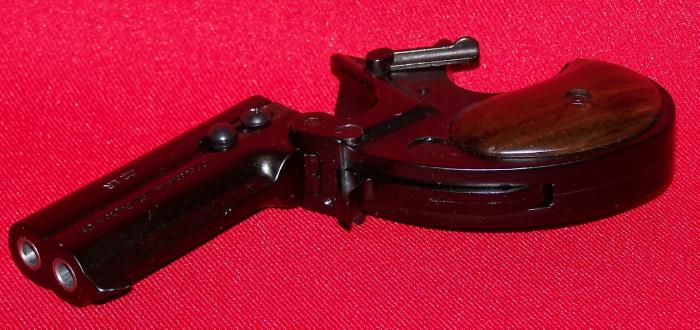 como se puede ver este nuevo modelo dispone de seguro y cachas en madera al aceite, buscando un poco por internet he encontrado en internet que en realidad es un Chiappa Firearms Double Eagle Derringer en .22 LR, pero este en fogueo