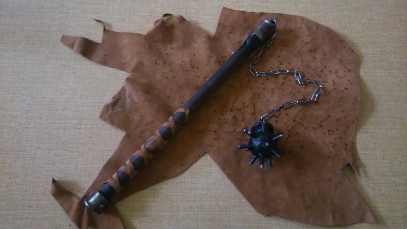 hola . te cuento una anecdota , ahora que te he visto esa maza de bola , pues resulta que de chaval me hice una para adorno , aprovechando la parte de arriba de un viejo gancho para persianas metalicas que era de madera coronado por un cilindro de acero , al que solde una cadena y una bola de acero que encontre en una chatarreria , pues el trasto estuvo colgado mas de veinte años , asta que un dia entro un rumano a robar a la lonja y como no se corto en dar ruido le oyo mi hemano , llamo a la policia y le detuvieron , al ver la policia la dichosa maza le dijeron a mi hermano que era un arma prohibida y que solo puede ser expuexta en museos y que si yo era neo nazi ? ....