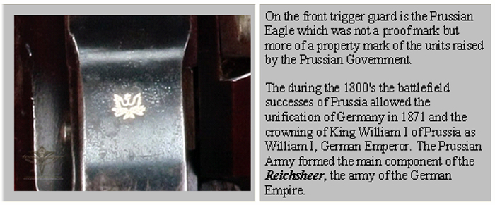 Pudieran ser un águila prusiano de aceptación de contrato prusiano, la RC coronada de la Comision de revisión de armas, un marcaje unitario (sería algo muy extraño, por no ser un lugar habitual para ello)… etc… se aceptan sugerencias.