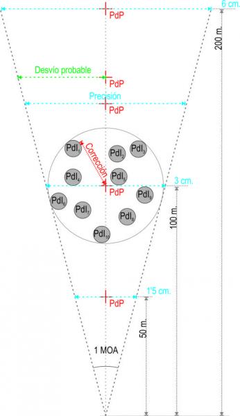 ....Esa pretendida colocación de los impactos (PdI ≈ PdP) se llama exactitud y se define por dos parámetros: precisión y corrección (Precisión + Corrección = Exactitud). Sin entrar en demasiados detalles, la precisión se define en relación inversamente proporcional al tamaño del agrupamiento de los impactos; un menor agrupamiento indica una mayor precisión. La corrección se define como la relación de cercanía entre el PdP y el PdI (o centro de impactos, si se trata de varios impactos); cuanto más próximos entre sí mayor corrección.