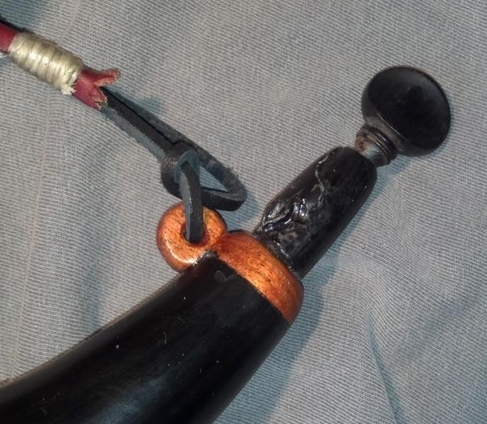 El cuerno de polvora que fabrique utilizando un cuerno de Bisonte Americano. Este material es muy dificil de pulir por lo fibroso que es. He hecho dos asi, pero ni uno mas!