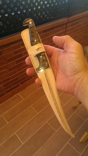 Aquí os dejo el mio de acero al carbono, pulido a espejo y asta de carnero, de Juan Martínez. Un saludo