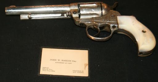 Court records show John Wesley Hardin was carrying a Colt "Lightning" revolver when he was shot and killed on August 19, 1895. The Colt, (with a .38 caliber, 2½" barrel) is nickel-plated, with blued hammer, trigger and screws. The back-strap is hand-engraved: "J.B.M. TO J.W.H." It has mother-of-pearl grips. This gun and its holster were once sold at auction for $168,000.