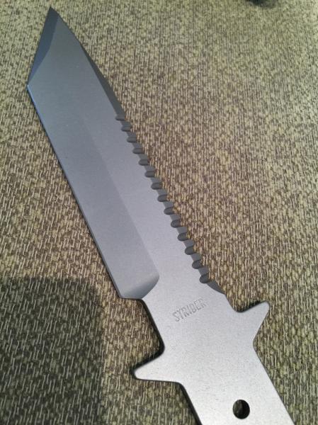 "Una tercera parte del lomo está compuesto por una sierra. No se parece para nada a la típica sierra que conocemos. Más bien se describiría como una más precisa atendiendo a los finos aserramientos triangulares con un doble bisel de geometría angulada. Los biseles angulados podrían servir como rompe-huesos."