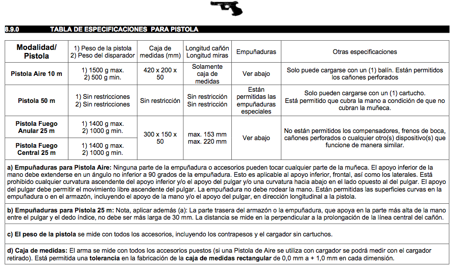 8.4.1.1.1 Ni la empuñadura ni cualquier otra parte de la pistola se podrán alargar o modificar en ningún sentido que pueda dar ayuda a la mano. La muñeca debe permanecer visiblemente libre cuando se sujeta la pistola en la posición normal de tiro. Brazaletes, relojes de pulsera, pulseras, o cualquier objeto similar están prohibidos en la mano o el brazo que empuña el arma.