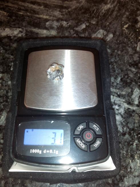 Os pongo una foto porque lo que si encontré es la puntica verde característica de esta bala con unos pocos restos de plomo. En total 2,1 gr de los 9,67 iniciales. Es decir, un 21,71%. El próximo día que vuelva, intentaré buscarla de nuevo porque creo que debe estar ahí, aunque es posible que esté completamente desintegrada... :?: :?: :?: :?: