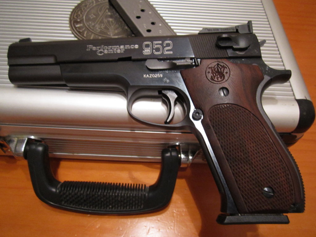 La S&W 952, la hay en versiones de 5" y 6". Yo tuve una de las primeras, las que venían pavonadas en 5", y sin seguro de empuñadura. Muy buen arma, pero solo pude sacarle partido recargando, la mia en concreto con munición comercial no iba nada bien en cuanto a precisión. A mi me gusta más la pavonada, pero es cuestión de gustos....
