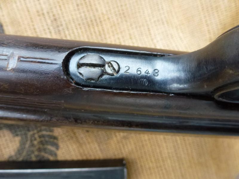Hola. Pongo en venta mi subfusil alemán "MP-40" bnz. 43, el subfusil esta inutilizado únicamente por fresado en recámara, por lo tanto la inutilización no es visible externamente. Es posible accionar todos sus mecanismos (monta, dispara en vacio...) El pavón es original y está en bastante buen estado sin óxido ni picaduras. La numeración de las piezas NO coinciden, algo bastante normal después de tantos años... (lo raro es ver su números coincidentes). Tiene un cargador original marcado kur 43.