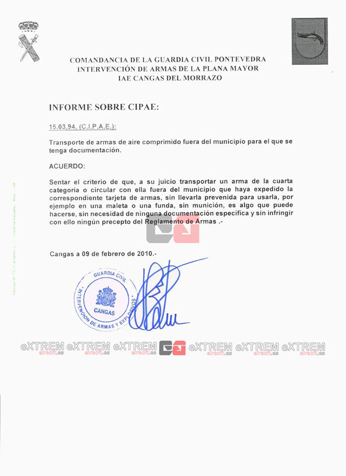 Como te han dicho los compañeros, no te vuelvas loco con el tema. Consulta las tarifas de unas cuantas empresas de envío de paquetería y decídete por la que mejor te parezca. Con respecto a hacerlo a través de Correos, los únicos habilitados para realizar el envío tanto nacional como internacional de armas de las categorías 4ª y 5ª y de los apartados 5 y 6 de la categoría 7ª son las empresas fabricantes, distribuidoras o comercializadoras de las mismas, no los particulares. Cuando te llegue la FWB sí que es conveniente que te pases por tu Ayto. para preguntar por los trámites necesarios para obtener la tarjeta de armas (recuerda hacer un contrato de compra-venta entre particulares de la pistola, con todos los datos de la misma y de comprador y vendedor). Con respecto al tema del transporte de las armas de aire comprimido fuera del ámbito del municipio de residencia del propietario ya se ha dicho aquí anteriormente en varias ocasiones que no hay problema. La CIPAE (Comisión Interministerial Permanente de Armas y Explosivos), determinó hace tiempo que se podía, como es de sentido común, transportar y circular con estas armas fuera del municipio expedidor de la tarjeta de armas sin que por ello se cometiera ninguna infracción. En concreto creo recordar, quizá esté equivocado, que esto se hizo a consecuencia de una consulta realizada por una unidad de la GC al respecto del uso y transporte de las carabinas de aire comprimido de las casetas de feria, que como es lógico se trasladan continuamente de localidad en localidad. Si cada vez que salimos a una tirada o campeonato tuviéramos que sacar una tarjeta de armas por cada localidad por la que pasáramos lo llevaríamos claro