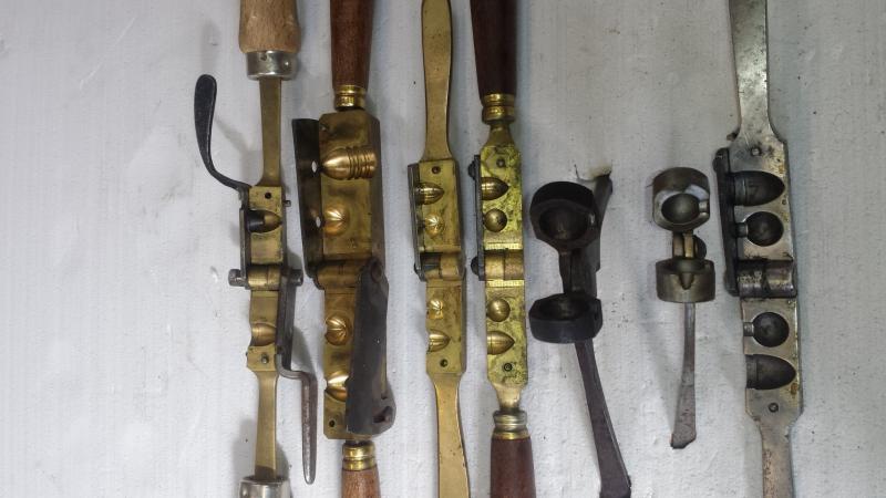 Y otras siete (7) que son las que vienen con sus pinzas solidarias, originales o copias de las antiguas de avancarga. Posiblemente alguna sea Pedersoli. Y en calibres 36, 44 y alguno más. Son dobles de bola y bala cónica.