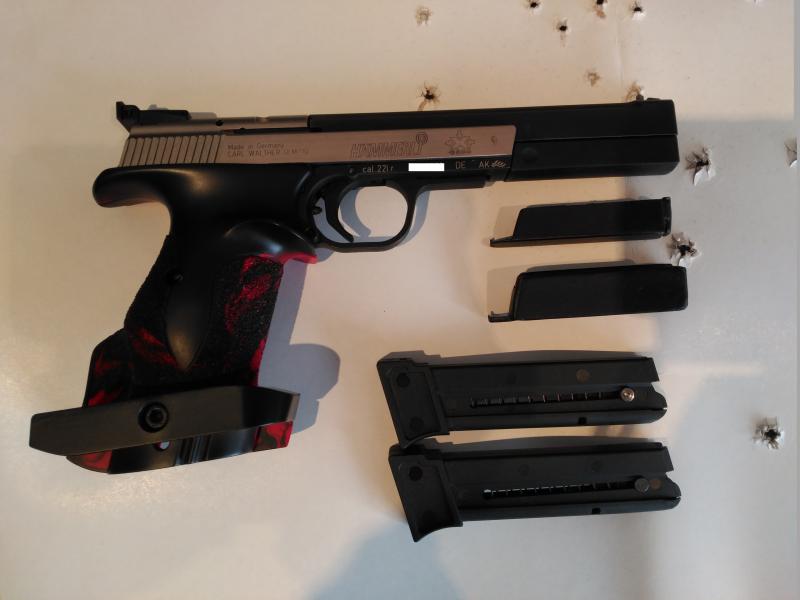 Se entrega con los accesorios originales, maletín, dos cargadores y tres contrapesos de 50, 100 y 165 gramos. El primer contrapeso es el original relleno de plomo y los otros dos son artesanales funcionando mediante imán. Se pueden intercambiar en un momento facilitando mucho la limpieza del arma.