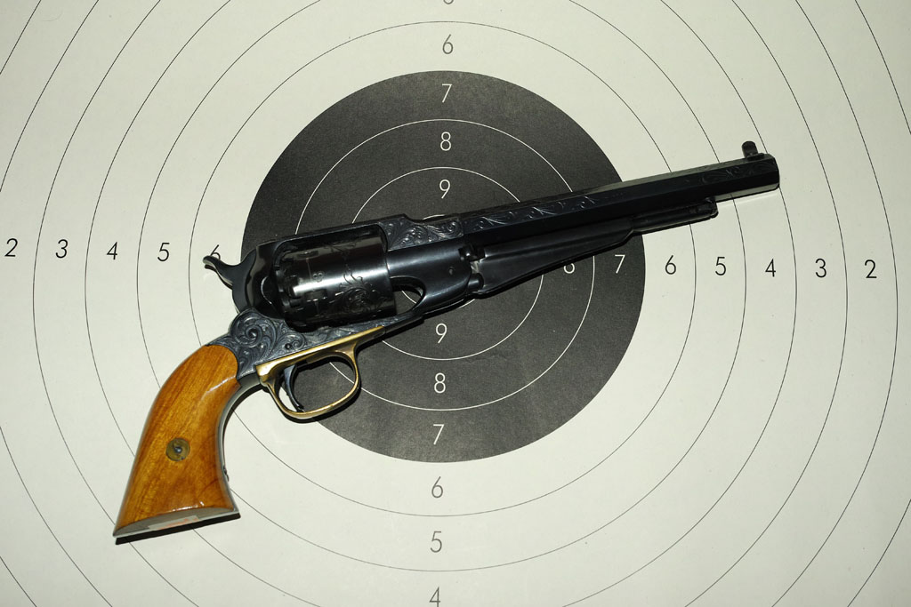 El revolver es el conocido Santa Bárbara en modelo labrado. Guiado el mismo día que la pistola. Está afinado por otro maestro armero-tirador de la zona, ya retirado de la competición pero que los iniciados conocen sobradamente. Calza un punto de mira Hege nuevo y listo para limar y ajustar a gusto del tirador. Ha sido en, al menos una ocasión que recuerde, campeón autonómico y primer clasificado en varias fases de Copa Presidente de temporadas anteriores. El arma está impecable.