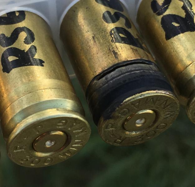 En cuanto a lo del cambio de tonalidad del latón, te pongo una foto. Esas vainas sólo han sido re calibradas una vez y disparadas solamente con la carga original Y ya tienen el cambio de tonalidad que indicas.