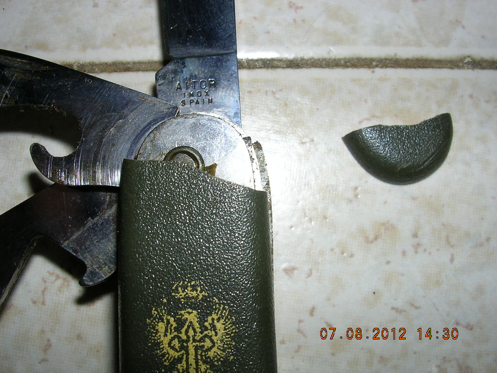 Aitor Pielcu no me gusta, te pongo dos navajas con el sacacorchos roto y otra con el emblema de la Academia de Suboficiales que ya vino con la cacha rora de fabrica.