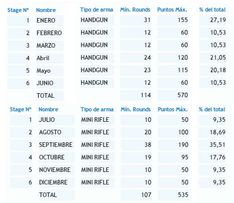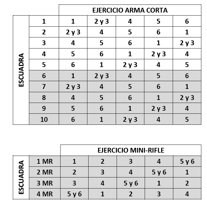 Los competidores de "MINI-RIFLE + ARMA CORTA" comienzan con los ejercicios de Mini-Rifle y continúan con los de Arma Corta.