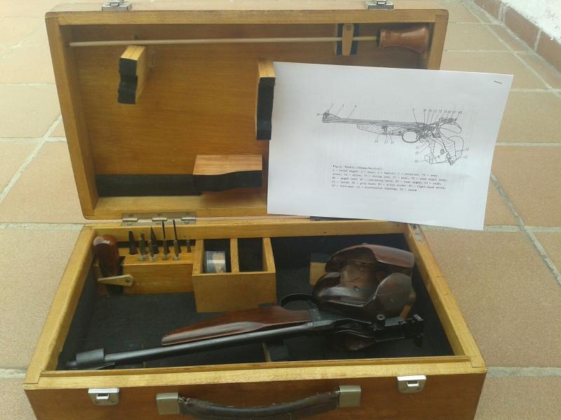 Caja original con todos los recambios de origen como percutor, muelles, puntos de mira, tableros, equipo completo de limpieza, etc.