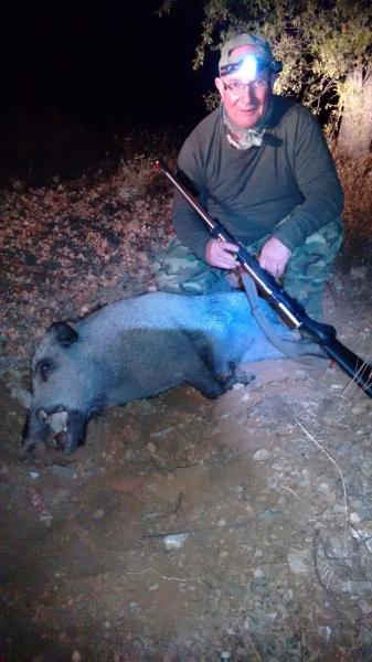 La cosa es que cuando entra el bicho y sabes que no tienes nada mas que un tiro, disparando con miras abiertas.... la linterna que tengo acoplada que no es gran cosa, tienes que afinar muy bien para darle en un sitio que lo pare en seco, por que como le quede algo de vida la has cagao, por que se te mete en algún barranco y a la 1 o las 2 de la mañana no te vas a poner a buscarlo. Por eso la carga del pólvora y la bala tienen que ser efectivas a 100%. En este caso no se movió cayó como si le hubiera dado un rayo. No se le ve sangre por que la salida de la bala la tiene en el lado que pega al suelo. Y no le quise dar la vuelta para que la foto no fuera muy sangrienta.