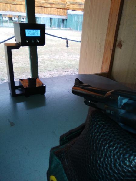 En el artículo menciono el metro de distancia que recomienda el fabricante para usar el R2A con armas de fuego, distancia que tras tantos años de pruebas y estudios, recomiendo también, pero no sólo para éste equipo, sino para todos, no obstante ello no significa que el R2 no lea correctamente a menor distancia, de hecho también se ha comentado que las pruebas realizadas con armas de aire se realizaron a pocos cms del aparato, como también se hicieron de igual forma test con pistolas y revolveres de fuego en calibres pequeños y medios obteniendo lecturas precisas (de 30 a 50 cms), en la misma mesa desde la que realizamos los disparos y con plena comodidad como veréis en las siguientes fotos. No obstante vuelvo a repetir, para cualquier medición con armas de fuego potentes como rifles y cortas del 357mag en adelante, recomiendo respetar 1 metro cómo mínimo, tanto por mantener la máxima precisión de lectura al separar el paso del proyectil de los humos y sombras producidos en la proximidad del cañón, como por seguridad para los medidores al quedar más salvaguardados de la proyección de partículas y calor sobre sus elementos, motivo por el cual suelo descartar todos los equipos que se abrochan sobre los cañones de las armas.