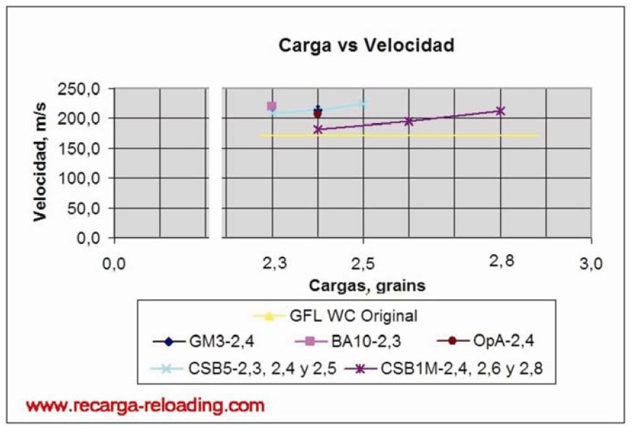 Yo recargo este calibre con 2,2 grains de BA-10 y con 2,3 de CSB-6, igualo la velocidad en el crono, ê impactos en la diana.