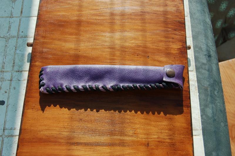 - Enzo Trapper N690Co scandi. Está usado, aunque reafilado y pulido (es duro de pulir el puñetero), pero aún se ven los marcajes en la hoja con el logo de Enzo y el tipo de acero. Le hice una funda de cuero forrada de tela vaquera y unas cachas finas de micarta vaquera hecha por mí. En ambos casos, los acabados no son "Pro". La funda permite ponerla o quitarla del cinto sin quitarse este, mediante una pollera (cierre de presión). Las cachas son muy finas porque lo llevaba en una funda tipo sobre (la púrpura que se ve en las fotos: muy de circunstancia y cutre, puramente funcional) en un bolsillo lateral de mi bolsa. Tiene no obstante, muy buen agarre. Al sujetarse elevada, portándolo con un pantalón vaquero no se ve prácticamente.