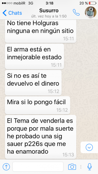 La veo anunciada y despues de hablar mucho por wasap ofreZco 700 euros pistola en casa y acepta la venta,pero siempre teniendo presente que me recoje el arma si no esta como dice,hasta me dice que es un modelo que salio asi de fabrica o eso cree el