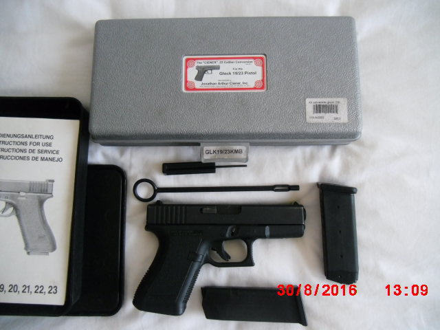 Es una ventaja ,tienes dos armas ,pero guiadas como una. Ademas es mas economico entrenar con la municion de .22. La conversion es original de J.A.CIENER de Cape Canaveral, USA. Para pistolas 19/23 de Glock. Un juego como medias naranjas. Perfeccion de confianza. Ambos cañones como nuevos . Ningunos fallos. Todo original ,no a gambiado nada. El conjunto esta en Granada a donde se puede probar. El precio es 420€ (porto inkl.) a cada IA peninsular. Por separado cuesta la pistola 250€ y la conversion 200€ , portos inkl.con Nacex. Gracias. Saludos.