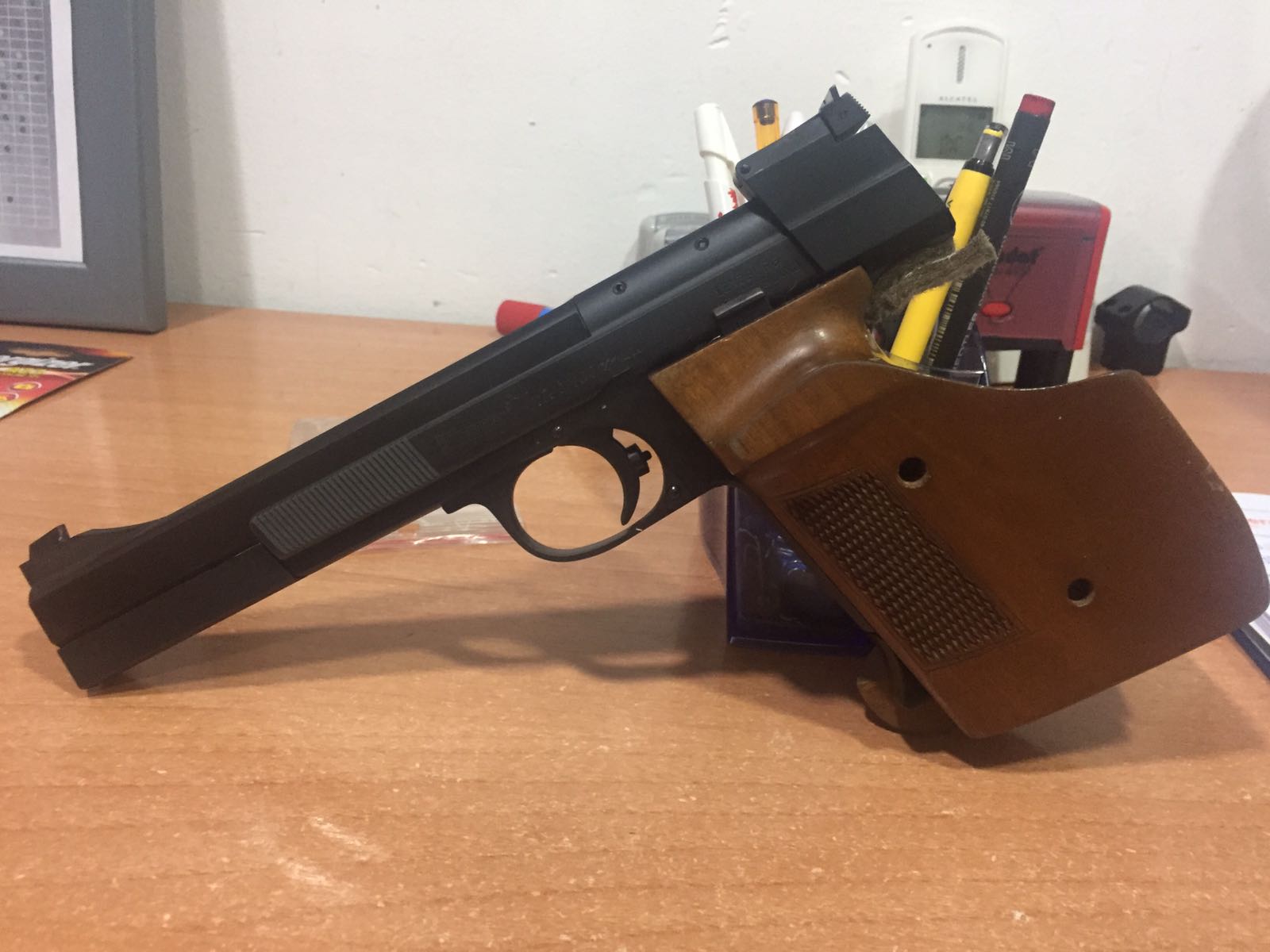 La tuve el siglo pasado y con ella subí a 1ª Especial. De las dos cachas con que me la vendieron, me iba mejor la cacha custom que la original. También venía con un contrapeso custom, unos gramos más pesado que el pesado original, que es con el que tiraba; en aquel tiempo tenía un brazo realmente fuerte y aún no se me había producido la epicondilitis (por una pistola de AC). Como nadie está exento de cometer gilipolladas, la vendí. La AW 93 de mi avatar no es mejor que ella.