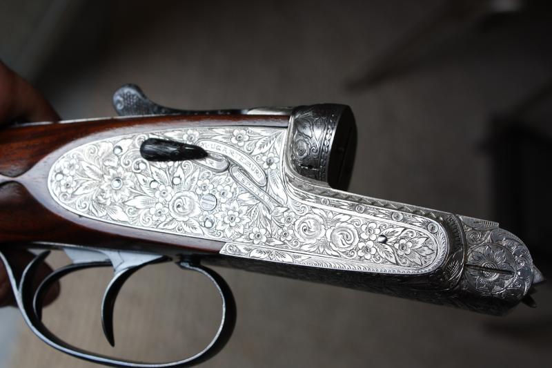 Extraordinarios grabados de la bascula, realizados a mano con motivos florales tipo Holland & Holland.