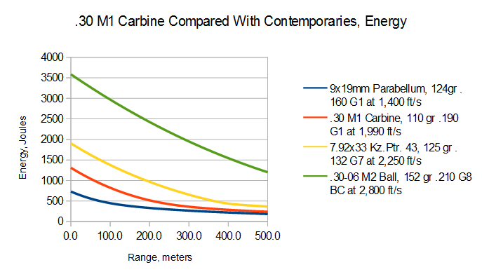 Balística? Ronda los 600 m/s en boca, con 7 gramos. No esta mal, mucho mejor que las pistolas evidentmente, y en cierto modo, se parece a un "fusil de asalto" moderno (controlable, y minimamente potente). Pero es una carabina, y sus balas con una punta de coeficiente balistico pobre, y la perforación en nada comparable al 30-06.