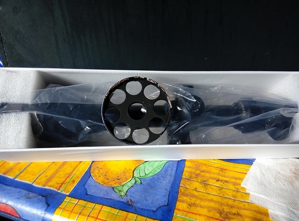 Una aclaración : La rueda de paralelaje es de aluminio pulido y la pinté yo de negro con pintura en spray. No soy un Velazquez precisamente :mrgreen: , por lo que se le ven algunas imperfecciones. El nuevo dueño puede repasar la pintura o meterla en disolvente y dejarla con su color plateado original. La rueda lleva de 4 tornillos de fijación a la torreta, lo que le da una fijación inmejorable.