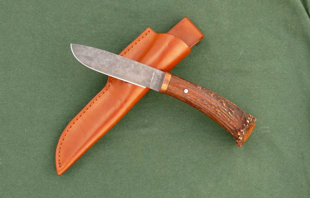 Hoja forjada a mano de acero al carbono 1084, este acero es el preferido por muchos maestros cuchilleros debido a que cuando es forjado y sometido a un tratamiento térmico adecuado, produce hojas de gran calidad con filos agudos y de gran tenacidad. El proceso químico de envejecimiento añade a la hoja un toque especial y la protege de manchas y óxido. Mango de la cuerna y roseta de un ciervo “cola blanca”, seleccionado por su belleza y relieve, sujeto a la espiga con un pasador de acero inoxidable y una virola/espaciador de cobre. Funda de cuero de gran calidad, hecha a medida, tipo petaca , que envuelve y protege la mayor parte del cuchillo.