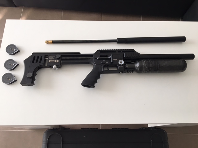 El equipo se compone de la carabina con cañon del 25 y dos cargadores de 25, y un cañon de 177 con un cargador, todo original y sin ningún tipo de modificación.