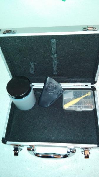 Revólver muy pequeñito, con 2 cilindros guiados calibre 22 NAA avancarga, cada cilindro con sus chimeneas correspondientes instaladas, dos fundas de cuero para cinturón (una marrón y la otra negra), maletín de transporte en aluminio, pólvora negra 3F, alicates de carga de cilindro, llave de chimeneas, 5 chimeneas de repuesto, cuchara para carga de pólvora con la medida correspondiente, pincho de limpieza de chimeneas, 50 proyectiles, 20 pistones, gran parte de los accesorios, introducidos y muy reducido, en una caja de plástico transparente pequeña ideada y adaptada.