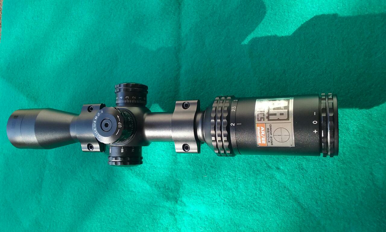 El segundo es el modelo 1-4x24 con retícula BTR-1 iluminada en primer plano, tubo de 30, longitud de 24 centímetros y un peso de 429 gramos. Cuenta igualmente con torretas tácticas reseteables. Por su nitidez y calidad óptica es perfecto para su uso en caza, con los aumentos al mínimo prácticamente funciona como un punto rojo y la retícula es perfectamente visible de día sobre fondo oscuro.