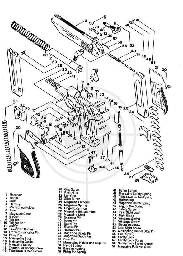 Hola al Foro a raiz de un infortunado hecho se me ha caído al piso esta pistola y se a producido la rotura de un perno acerado de sujeción de la bieleta de la cola del disparador o gatillo .Pero me he dado cuenta que falta tambien un muelle o resorte .Como no he podido encontrar información al respecto y agotada la posibilidad que la actual firma Bernardelli me envié el despiece en un archivo PDF.Para asi poder ver como es la forma del muelle o resorte recuperador del gatillo.Estoy dejando aquí este pedido de solución.Desde ya les agradezco por su tiempo y dedicación.