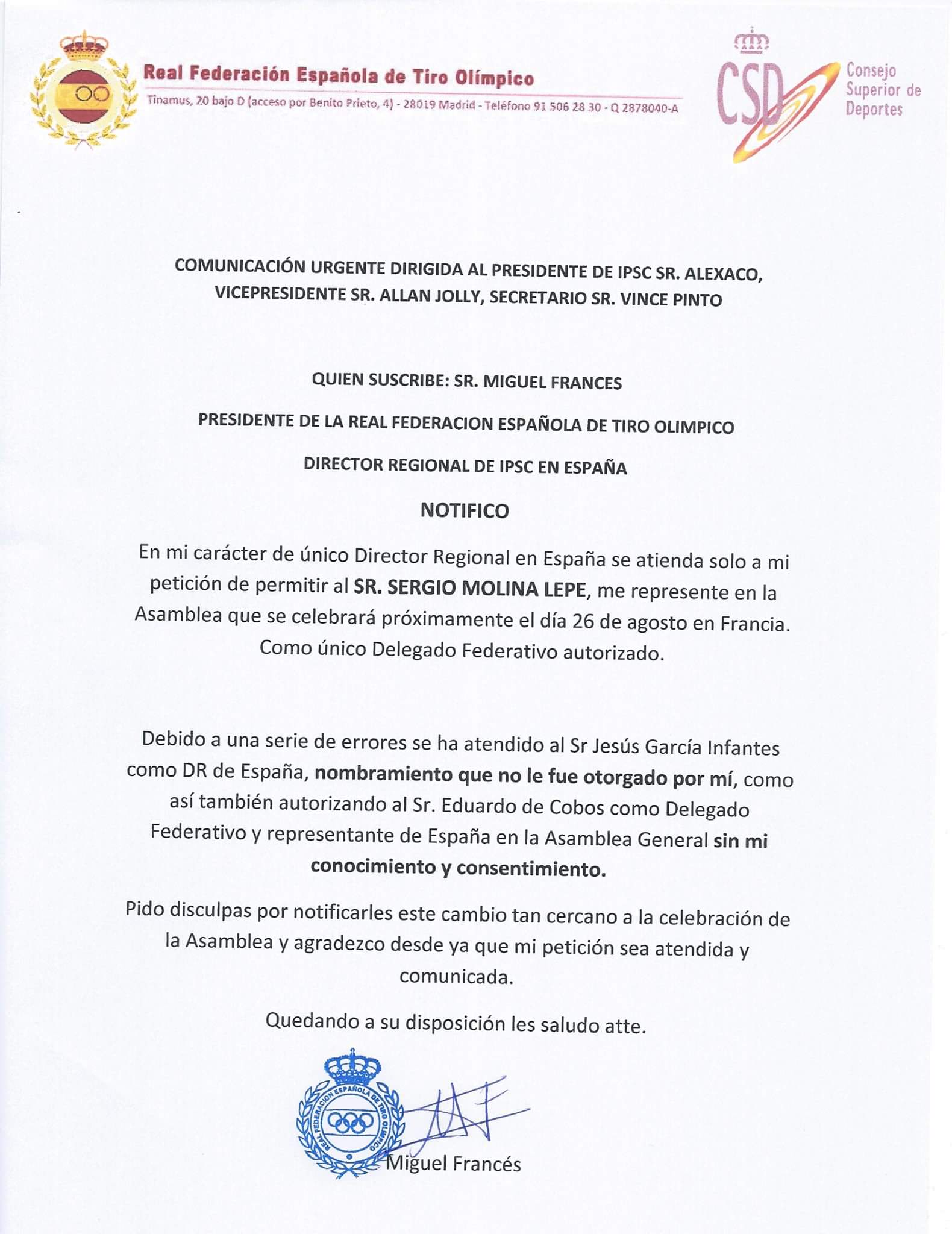 DIMITA SR. FRANCÉS, ha demostrado ser un traidor a su propio equipo, además de absolutamente incapaz de desempeñar su función. Por ende no tiene palabra y el desprecio que ha hecho a todo los deportistas españoles de IPSC además de la bochornosa situación en la que nos ha colocado requieren su DIMISIÓN INMEDIATA.