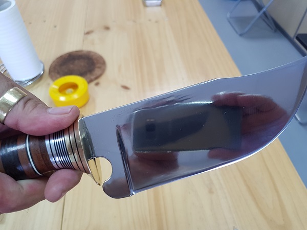 acero 9260 templado a 58-59 HRC ojo, es acero carbono...no es inoxidable, va cogiendo pátina con el uso