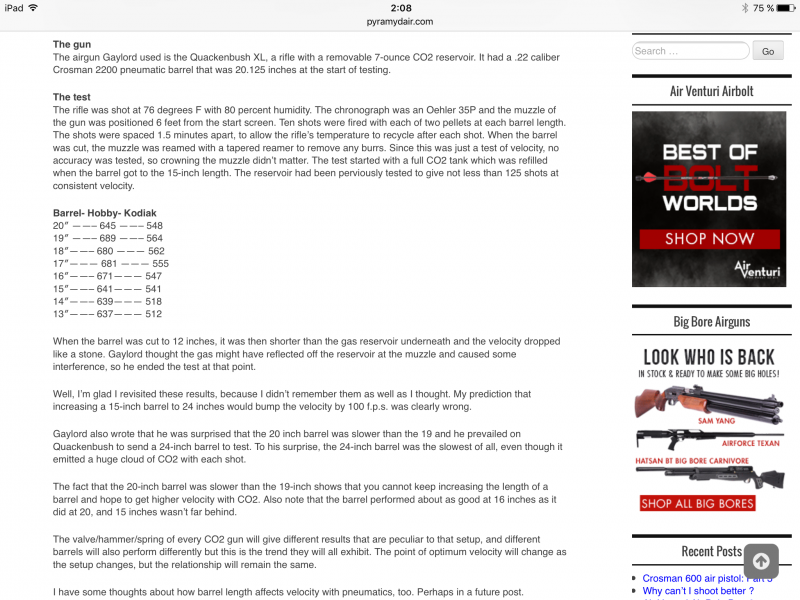 Aunque en ingles, podreis traducirlo y comprobareis lo q acabo de comentar de como el balin propulsado por Co2 se frena a partir de las 20 pulgadas de largura de cañon. A mi me va muy bien.