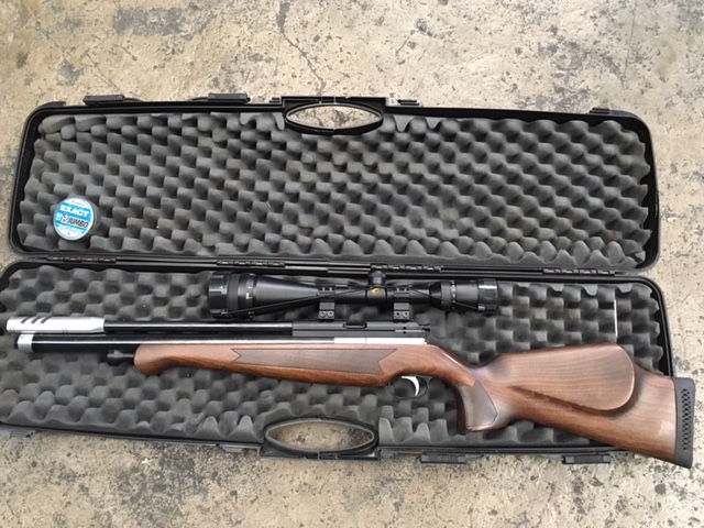 - carabina PCP BSA HORNET ultra calibre 5,5, con depósito de carga largo de gran capacidad. Embellecedor de aluminio en extremo del cañón. El visor es un gamo 24x50