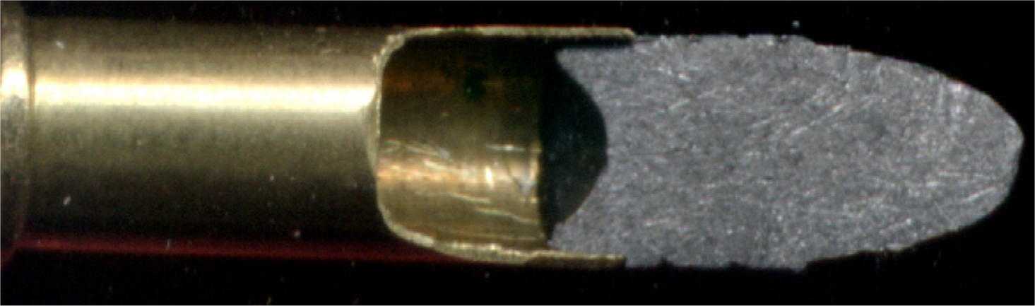 Es normal, tu municion del .22 LR no está defectuosa y funcionará perfectamente. En el 22 LR el diámetro de la bala es el mismo que el diámetro de la vaina y la parte inferior de la bala dentro de la vaina es de menor diámetro con una base ahuecada para que expanda dentro de la vaina, la vaina está engarzada para sujetar la bala en la vaina, no para evitar que gire.