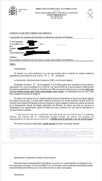 Hola, deciros que sigo sin conseguir la E y D, mandé consulta al ICAE y me respondieron que lo resolviese mi IA. después de casi 3 meses desde la solicitud, la semana pasada me llamaron para que les firmará un documento en el que me daban 10 días para que les documentara porqué a mi entender estoy exento de realizar las pruebas de capacitación teniendo la F de segunda categoría o daban por cerrada mi solicitud , les presenté fotocopia de mi guía de pertenencia de una carabina del 22 que tengo guiada con mi F y copia de varios escritos como el del compañero Parrish de compañeros que recibieron esa misma contestación del ICAE, me consta que no soy yo el único al que se le está rechazando y que es un nuevo criterio que quiere seguir el ICAE sobre este tema, si al final no me la conceden, el siguente paso será emprender alguna acción por agravio comparativo,