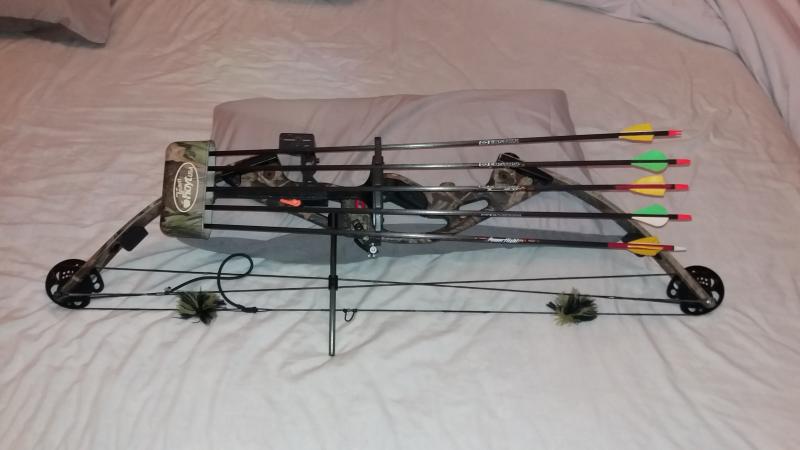 El arco es un Hoyt Magnatech Intruder para diestros regulable a 60 - 70 líbras de potencia y a 29 - 31 pulgadas de apertura. Incluye visor de 5 pines, reposaflechas regulable GKF de los de cuernos, peep autoalineable con goma, silenciadores de cuerda y de palas (estos son caseros) y carcaj de arco de 5 flechas (las flechas no están incluidas). También incluyo la bolsa de transporte de la foto.