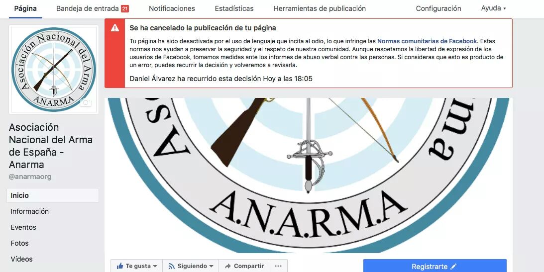PAGINA DEL FACEBOOK DE ANARMA SUSPENDIDA POR INCITACION AL ODIO.