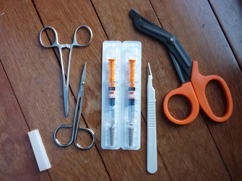 Lleva gasas y vendas de distintos tamaños, apositos esteriles grandes y medianos, 2 rollos de esparadrapo, guantes de nitrilo, pinzas, suero, povidona yodada (Betadine, 5 unds), bisturi y tijeras finas y de pinzar (de acero quirurgico), anticoagulante Clexane 60mg -Enoxaparina- 2 jeringuillas precargadas, y analgesia (1 ampolla de Nolotil 0,4 gr inyectable).