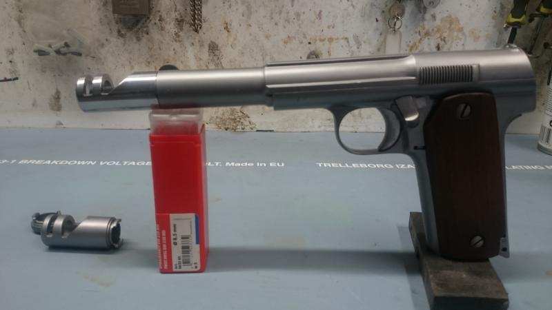 Hola a todos,os paso unas fotos del ultimo experimento que hice con una 400,la idea se me ocurrio cuando un dia buscando informacion de las ASTRA 400 encontre unas fotos de unas que hizo la fabrica sobre los años 30 para competir, me gusto como le quedaba y desde la foto saque las medidas y me decidi a probar aver que salia, el resultado ahi lo dejo para que opine cada uno, ya lo tengo probado con mas de 200 tiros de municion original y sin ningun tipo de problema ni desgaste raro, lo que no tengo claro es si funciona bien ya que soy un manta con arma corta, pero quedar le queda de fruta madre.