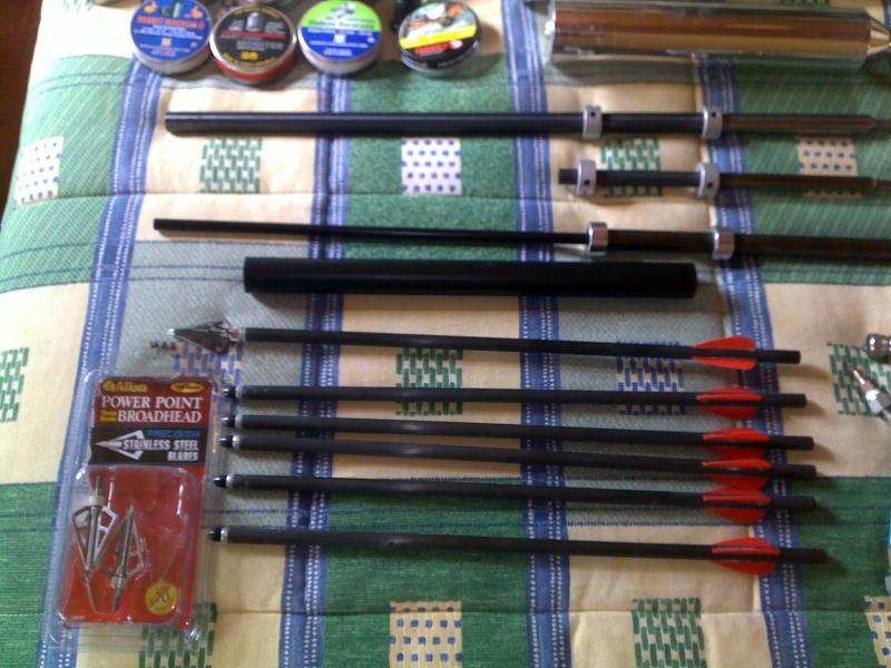 cuatro cañones. 6,35, .22 corto, .22 largo y cañón para flechas impresionante, seis flechas de carbono + tres puntas de caza