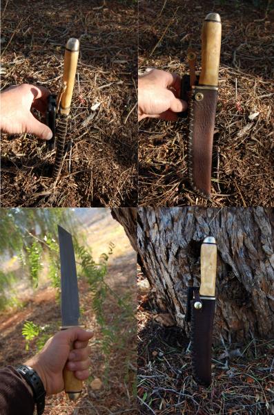 La hoja estaba usada y restaurada, pero no maltratada. Es decir, no ha sido bastoneado ni aporreado ni nada así. Así que me decidí a hacer algo con él, porque el mango de plástico me parece feo. Va en una funda sencilla a la que he puesto un cierre TeckLock para el cinto, sujeto con 4 tornillos al cuero. El cierre de la funda, va con otro tornillo al Teck Lock, y todos fijados con cianoacrilato.